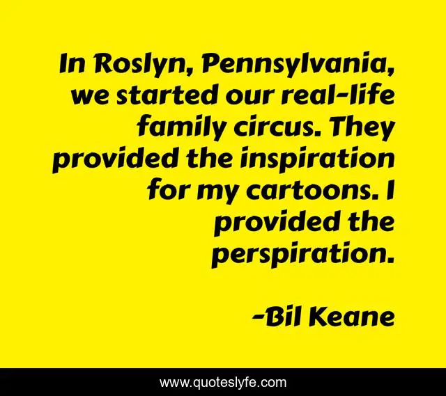 This page presents the quote "In Roslyn, Pennsylvania, we started our real-life family circus. They provided the inspiration for my cartoons. I provided the perspiration.". Author of this quote is Bil Keane. This quote is about started, circus, inspiration,.