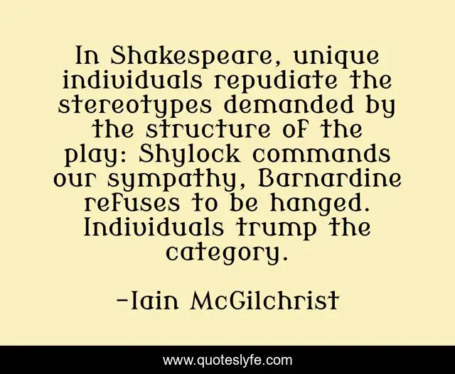 This page presents the quote "In Shakespeare, unique individuals repudiate the stereotypes demanded by the structure of the play: Shylock commands our sympathy, Barnardine refuses to be hanged. Individuals trump the category.". Author of this quote is Iain McGilchrist. This quote is about play, unique, stereotypes,.