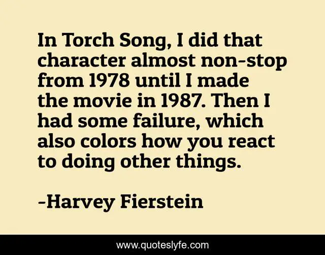 This page presents the quote "In Torch Song, I did that character almost non-stop from 1978 until I made the movie in 1987. Then I had some failure, which also colors how you react to doing other things.". Author of this quote is Harvey Fierstein. This quote is about colors, character, song,.