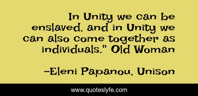 This page presents the quote "In Unity we can be enslaved, and in Unity we can also come together as individuals." Old Woman". Author of this quote is Eleni Papanou, Unison. .