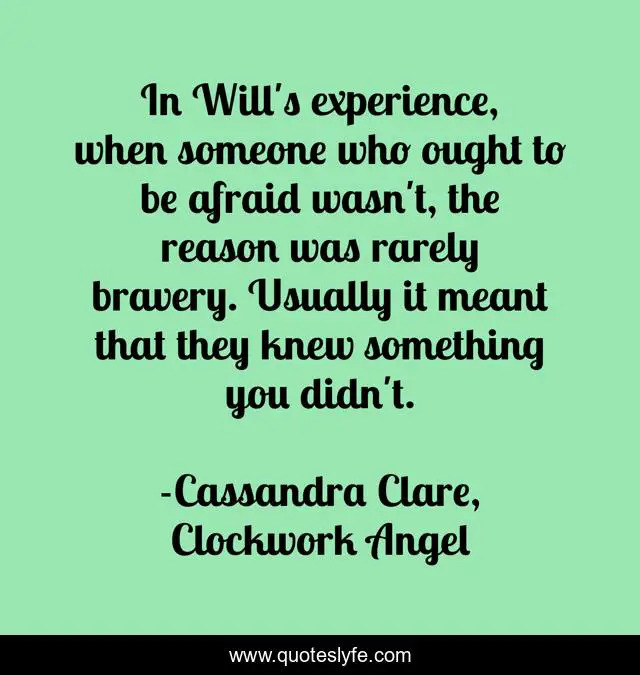 This page presents the quote "In Will's experience, when someone who ought to be afraid wasn't, the reason was rarely bravery. Usually it meant that they knew something you didn't.". Author of this quote is Cassandra Clare, Clockwork Angel. This quote is about will-herondale, bravery,.