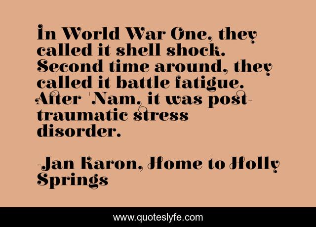 This page presents the quote "In World War One, they called it shell shock. Second time around, they called it battle fatigue. After 'Nam, it was post-traumatic stress disorder.". Author of this quote is Jan Karon, Home to Holly Springs. This quote is about world-war-1, shell-shock, posttraumatic-stress-disorder, ptsd, battle-fatigue, world-war-two, post-traumatic-stress-disorder, veterans, war,.