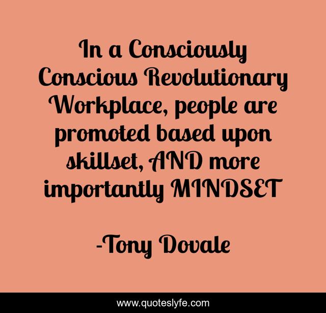 This page presents the quote "In a Consciously Conscious Revolutionary Workplace, people are promoted based upon skillset, AND more importantly MINDSET". Author of this quote is Tony Dovale. This quote is about consciously-conscious, tony-dovale, life-masters, leadership, leadership-experts, revolutionary-workplace, high-performance-teams, happiness-work, staff-engagement,.