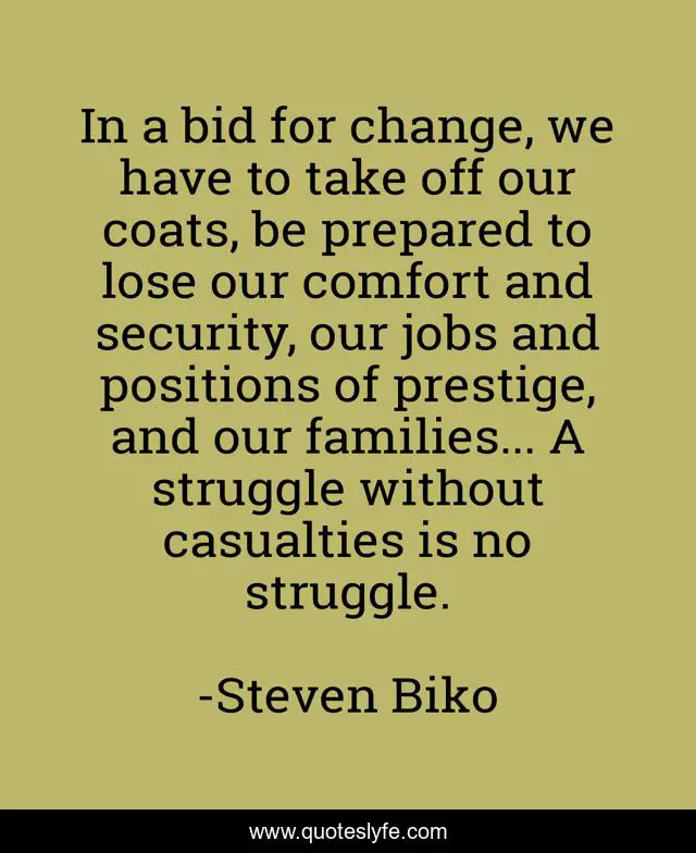 This page presents the quote "In a bid for change, we have to take off our coats, be prepared to lose our comfort and security, our jobs and positions of prestige, and our families... A struggle without casualties is no struggle.". Author of this quote is Steven Biko. This quote is about comfort, struggle,.