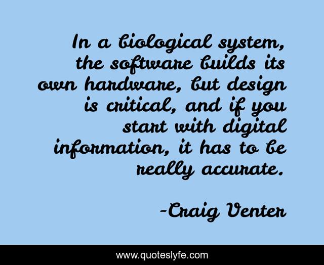 This page presents the quote "In a biological system, the software builds its own hardware, but design is critical, and if you start with digital information, it has to be really accurate.". Author of this quote is Craig Venter. This quote is about start, information, digital,.
