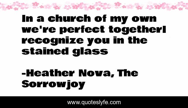 This page presents the quote "In a church of my own we're perfect togetherI recognize you in the stained glass". Author of this quote is Heather Nova, The Sorrowjoy. This quote is about lifetime, soulmate, love, affection, church,.