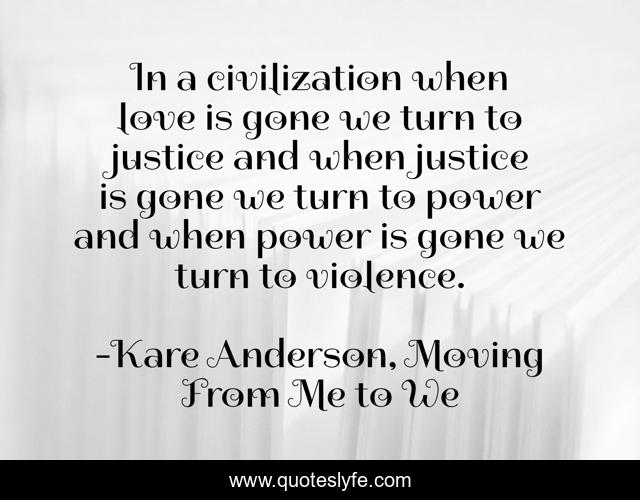 This page presents the quote "In a civilization when love is gone we turn to justice and when justice is gone we turn to power and when power is gone we turn to violence.". Author of this quote is Kare Anderson, Moving From Me to We. This quote is about friendship, connection, opportunity,.