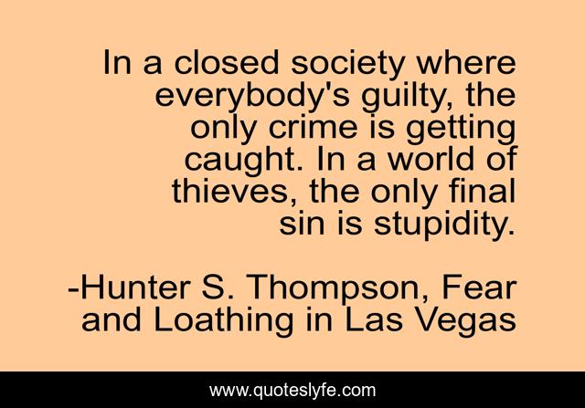 This page presents the quote "In a closed society where everybody's guilty, the only crime is getting caught. In a world of thieves, the only final sin is stupidity.". Author of this quote is Hunter S. Thompson, Fear and Loathing in Las Vegas. .