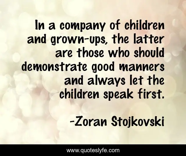 This page presents the quote "In a company of children and grown-ups, the latter are those who should demonstrate good manners and always let the children speak first.". Author of this quote is Zoran Stojkovski. .