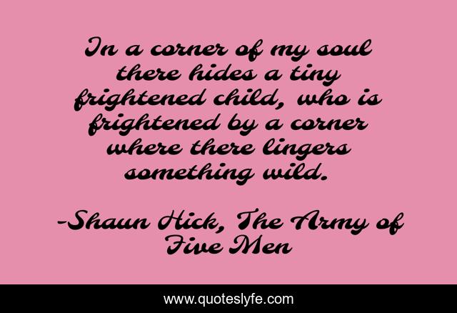 This page presents the quote "In a corner of my soul there hides a tiny frightened child, who is frightened by a corner where there lingers something wild.". Author of this quote is Shaun Hick, The Army of Five Men. This quote is about personalities, human-nature, mask, truth, alter-ego, hides, child, wild, faces-of-man,.