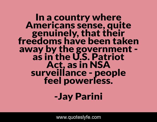 This page presents the quote "In a country where Americans sense, quite genuinely, that their freedoms have been taken away by the government - as in the U.S. Patriot Act, as in NSA surveillance - people feel powerless.". Author of this quote is Jay Parini. This quote is about country, patriot, people,.