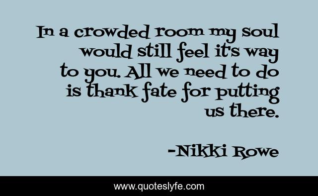 This page presents the quote "In a crowded room my soul would still feel it's way to you. All we need to do is thank fate for putting us there.". Author of this quote is Nikki Rowe. This quote is about soul-recognition, soul-seeker, destiny, synchronicity, soul, walk-your-path, twin-flame, courage, date,.