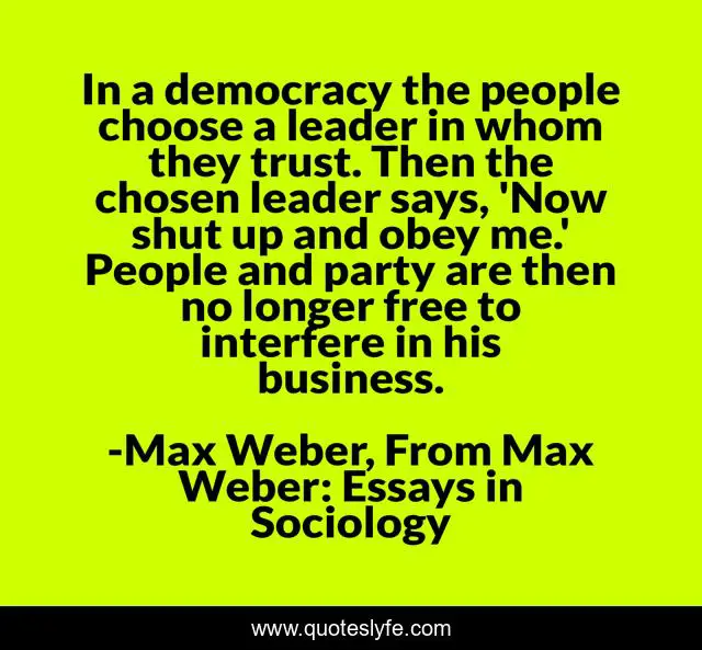 This page presents the quote "In a democracy the people choose a leader in whom they trust. Then the chosen leader says, 'Now shut up and obey me.' People and party are then no longer free to interfere in his business.". Author of this quote is Max Weber, From Max Weber: Essays in Sociology. This quote is about max-weber, leader, democracy,.