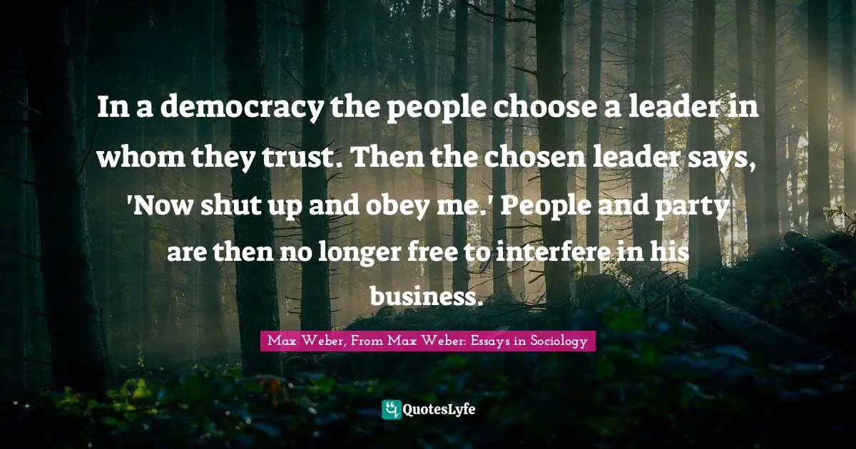 "Max Weber, From Max Weber: Essays in Sociology Quotes." Quoteslyfe.com, 2025. Tue. 30 Dec. 2025. <https://www.quoteslyfe.com/quote/In-a-democracy-the-people-choose-a-200259>.
