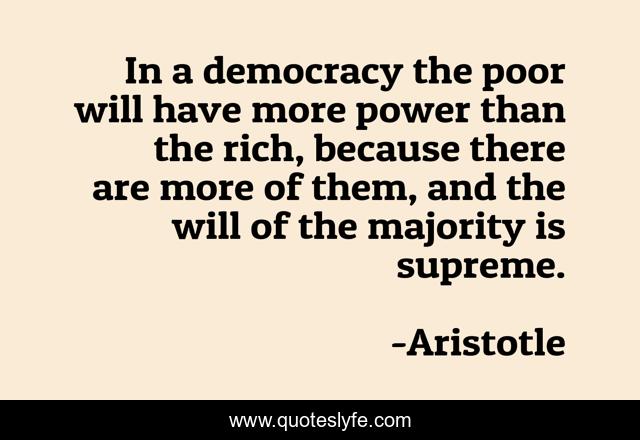 This page presents the quote "In a democracy the poor will have more power than the rich, because there are more of them, and the will of the majority is supreme.". Author of this quote is Aristotle. This quote is about poor, democracy, rich,.