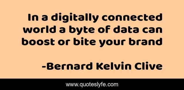 This page presents the quote "In a digitally connected world a byte of data can boost or bite your brand". Author of this quote is Bernard Kelvin Clive. This quote is about personal-branding, social-media, digital-brands, reputation-management, data-security,.