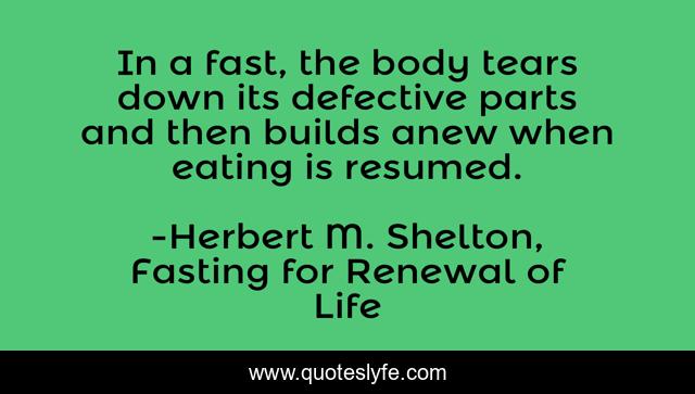 This page presents the quote "In a fast, the body tears down its defective parts and then builds anew when eating is resumed.". Author of this quote is Herbert M. Shelton, Fasting for Renewal of Life. This quote is about natural-hygiene, fasting, health, healing, nature-cure,.