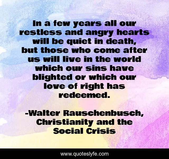 This page presents the quote "In a few years all our restless and angry hearts will be quiet in death, but those who come after us will live in the world which our sins have blighted or which our love of right has redeemed.". Author of this quote is Walter Rauschenbusch, Christianity and the Social Crisis. This quote is about social-gospel, theology,.