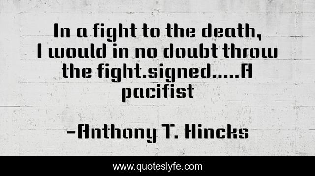 This page presents the quote "In a fight to the death, I would in no doubt throw the fight.signed.....A pacifist". Author of this quote is Anthony T. Hincks. This quote is about fight, death, throw, philosophy, pacifist,.
