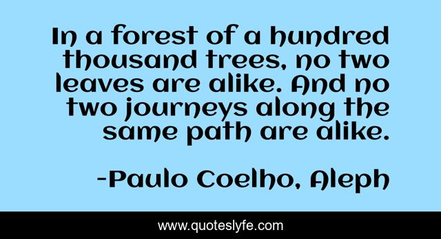 This page presents the quote "In a forest of a hundred thousand trees, no two leaves are alike. And no two journeys along the same path are alike.". Author of this quote is Paulo Coelho, Aleph. This quote is about experiences, trees, journeys,.