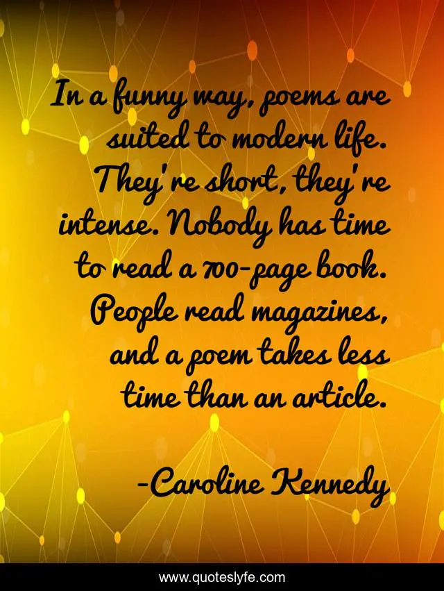 This page presents the quote "In a funny way, poems are suited to modern life. They're short, they're intense. Nobody has time to read a 700-page book. People read magazines, and a poem takes less time than an article.". Author of this quote is Caroline Kennedy. This quote is about life, short, time,.