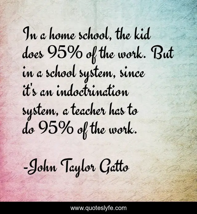 This page presents the quote "In a home school, the kid does 95% of the work. But in a school system, since it's an indoctrination system, a teacher has to do 95% of the work.". Author of this quote is John Taylor Gatto. This quote is about home, school, work,.