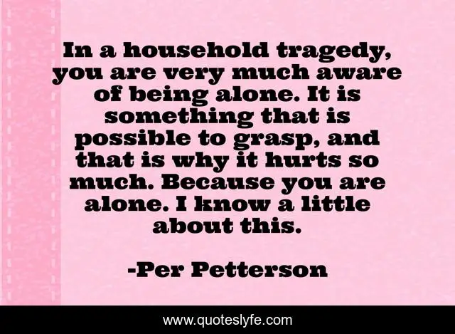This page presents the quote "In a household tragedy, you are very much aware of being alone. It is something that is possible to grasp, and that is why it hurts so much. Because you are alone. I know a little about this.". Author of this quote is Per Petterson. This quote is about tragedy, being alone,.