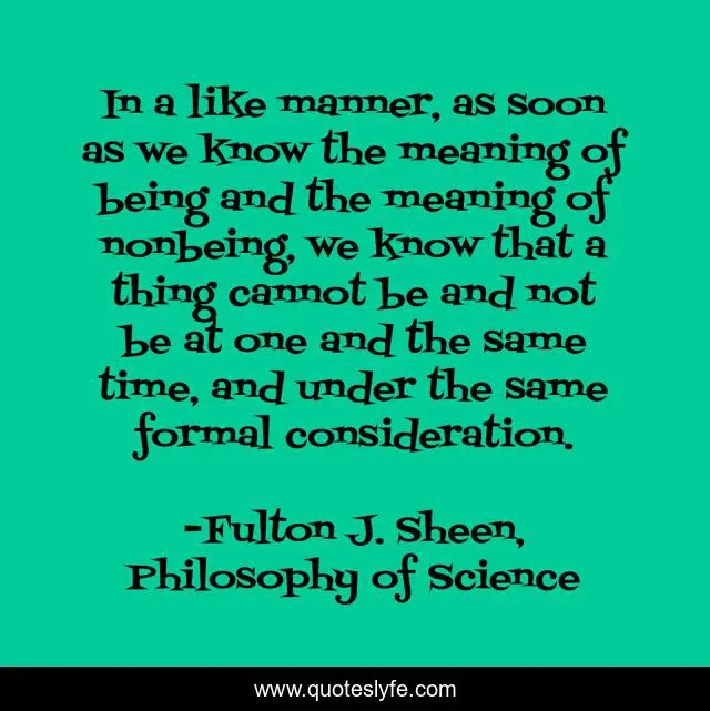 This page presents the quote "In a like manner, as soon as we know the meaning of being and the meaning of nonbeing, we know that a thing cannot be and not be at one and the same time, and under the same formal consideration.". Author of this quote is Fulton J. Sheen, Philosophy of Science. .