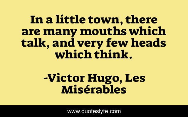 This page presents the quote "In a little town, there are many mouths which talk, and very few heads which think.". Author of this quote is Victor Hugo, Les Misérables. This quote is about conventional-wisdom, slander, gossip,.
