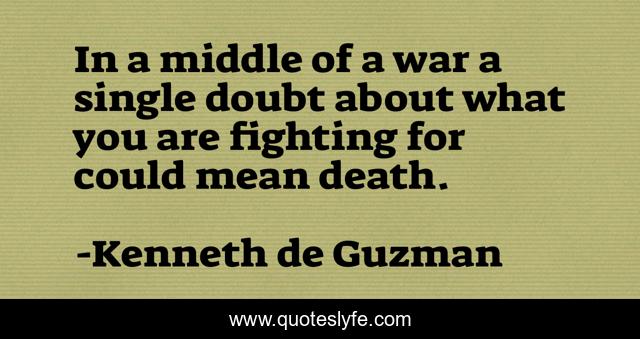 This page presents the quote "In a middle of a war a single doubt about what you are fighting for could mean death.". Author of this quote is Kenneth de Guzman. This quote is about death, doubt, fighting-for, war,.
