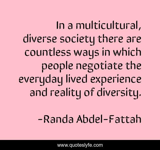 This page presents the quote "In a multicultural, diverse society there are countless ways in which people negotiate the everyday lived experience and reality of diversity.". Author of this quote is Randa Abdel-Fattah. This quote is about society, diversity, reality,.