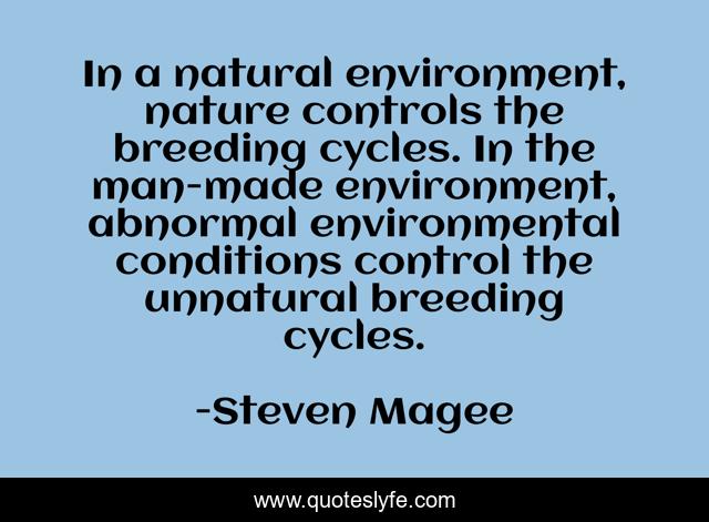 This page presents the quote "In a natural environment, nature controls the breeding cycles. In the man-made environment, abnormal environmental conditions control the unnatural breeding cycles.". Author of this quote is Steven Magee. This quote is about made, natural, nature, unnatural, abnormal, controls, environment, environmental, different-set,.