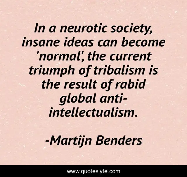 This page presents the quote "In a neurotic society, insane ideas can become 'normal', the current triumph of tribalism is the result of rabid global anti-intellectualism.". Author of this quote is Martijn Benders. This quote is about anti-intellectualism, insanity,.
