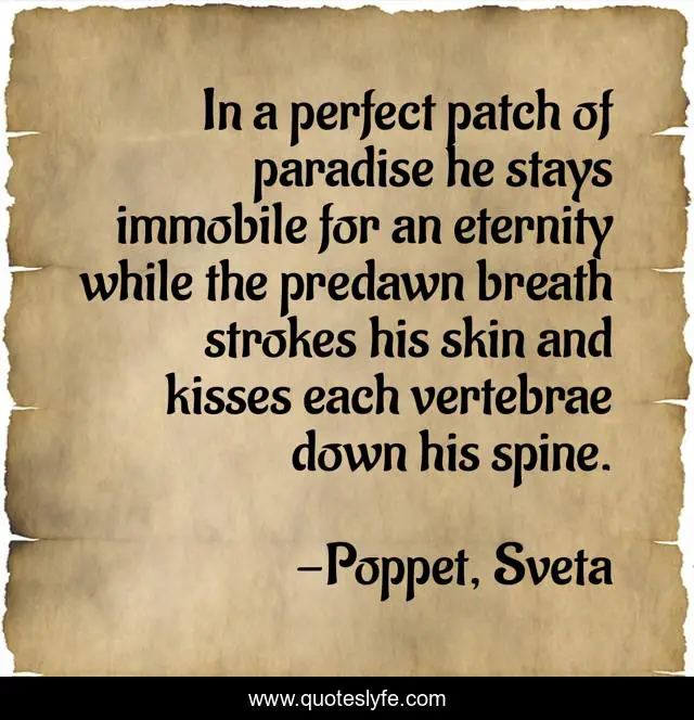 This page presents the quote "In a perfect patch of paradise he stays immobile for an eternity while the predawn breath strokes his skin and kisses each vertebrae down his spine.". Author of this quote is Poppet, Sveta. This quote is about paranormal-romance, vampire-romance,.