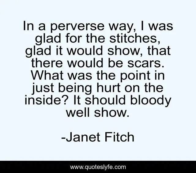 This page presents the quote "In a perverse way, I was glad for the stitches, glad it would show, that there would be scars. What was the point in just being hurt on the inside? It should bloody well show.". Author of this quote is Janet Fitch. This quote is about visible, hurt, scars, white-oleander, stitches,.