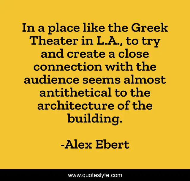 This page presents the quote "In a place like the Greek Theater in L.A., to try and create a close connection with the audience seems almost antithetical to the architecture of the building.". Author of this quote is Alex Ebert. This quote is about building, try, place,.