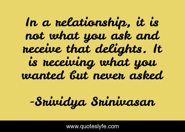 This page presents the quote "In a relationship, it is not what you ask and receive that delights. It is receiving what you wanted but never asked". Author of this quote is Srividya Srinivasan. .