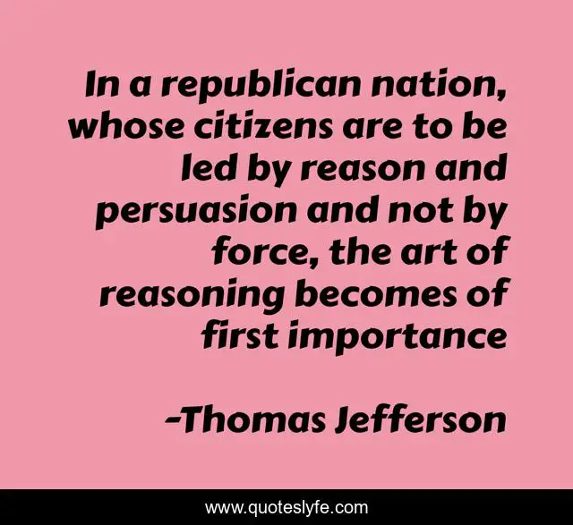 This page presents the quote "In a republican nation, whose citizens are to be led by reason and persuasion and not by force, the art of reasoning becomes of first importance". Author of this quote is Thomas Jefferson. This quote is about reason, citizenship, democracy, logic,.