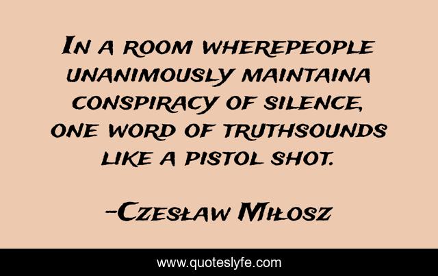 This page presents the quote "In a room wherepeople unanimously maintaina conspiracy of silence, one word of truthsounds like a pistol shot.". Author of this quote is Czesław Miłosz. This quote is about truth, democracy, dissent, virtue, truth-telling, heroes, integrity, honesty,.