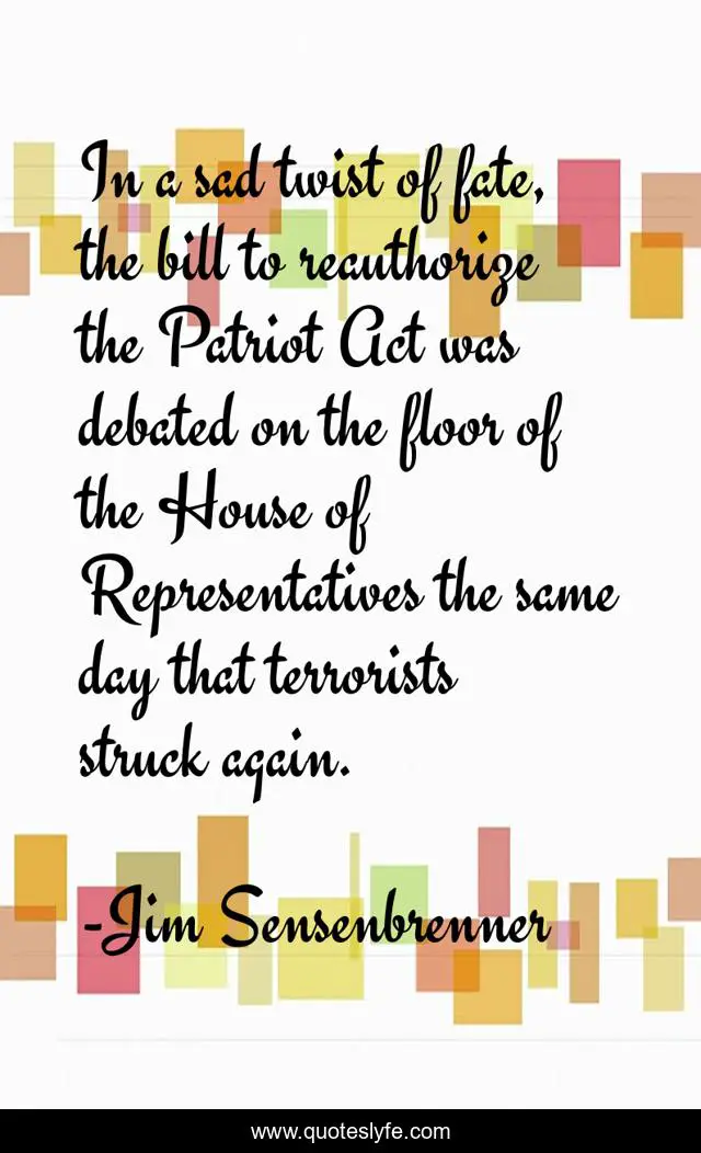 This page presents the quote "In a sad twist of fate, the bill to reauthorize the Patriot Act was debated on the floor of the House of Representatives the same day that terrorists struck again.". Author of this quote is Jim Sensenbrenner. This quote is about patriot, day, fate,.