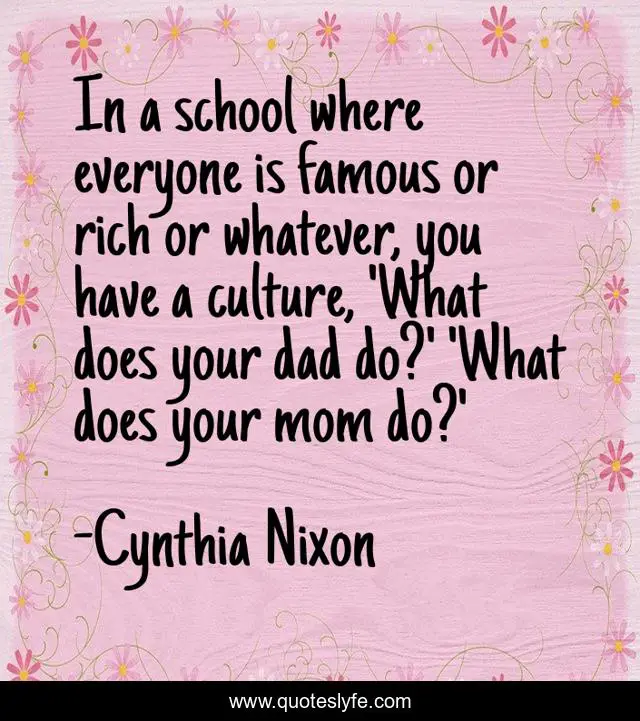 This page presents the quote "In a school where everyone is famous or rich or whatever, you have a culture, 'What does your dad do?' 'What does your mom do?'". Author of this quote is Cynthia Nixon. This quote is about culture, school, mom,.