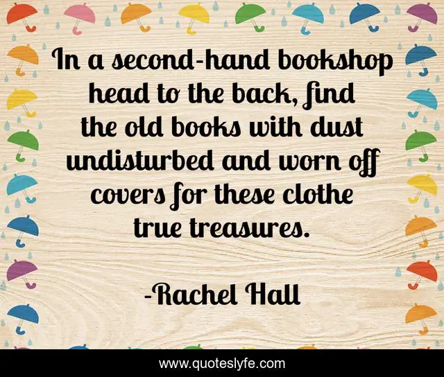 This page presents the quote "In a second-hand bookshop head to the back, find the old books with dust undisturbed and worn off covers for these clothe true treasures.". Author of this quote is Rachel Hall. This quote is about bookstore, books, book-lovers,.