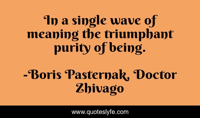 This page presents the quote "In a single wave of meaning the triumphant purity of being.". Author of this quote is Boris Pasternak, Doctor Zhivago. This quote is about aesthetics, being, existentialism, poetry, boris-pasternak, meaning, doctor-zhivago, singularity,.