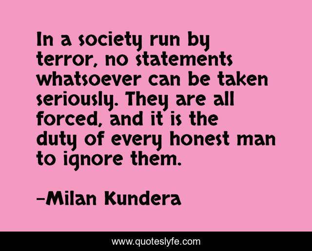 This page presents the quote "In a society run by terror, no statements whatsoever can be taken seriously. They are all forced, and it is the duty of every honest man to ignore them.". Author of this quote is Milan Kundera. This quote is about terrorism, censorship, hegemony, propaganda,.