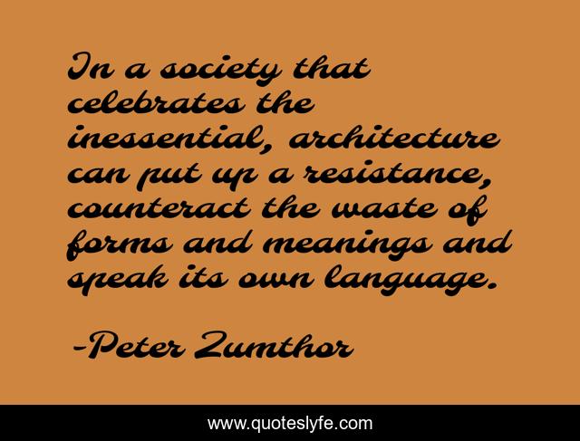 This page presents the quote "In a society that celebrates the inessential, architecture can put up a resistance, counteract the waste of forms and meanings and speak its own language.". Author of this quote is Peter Zumthor. This quote is about society, language, speak,.