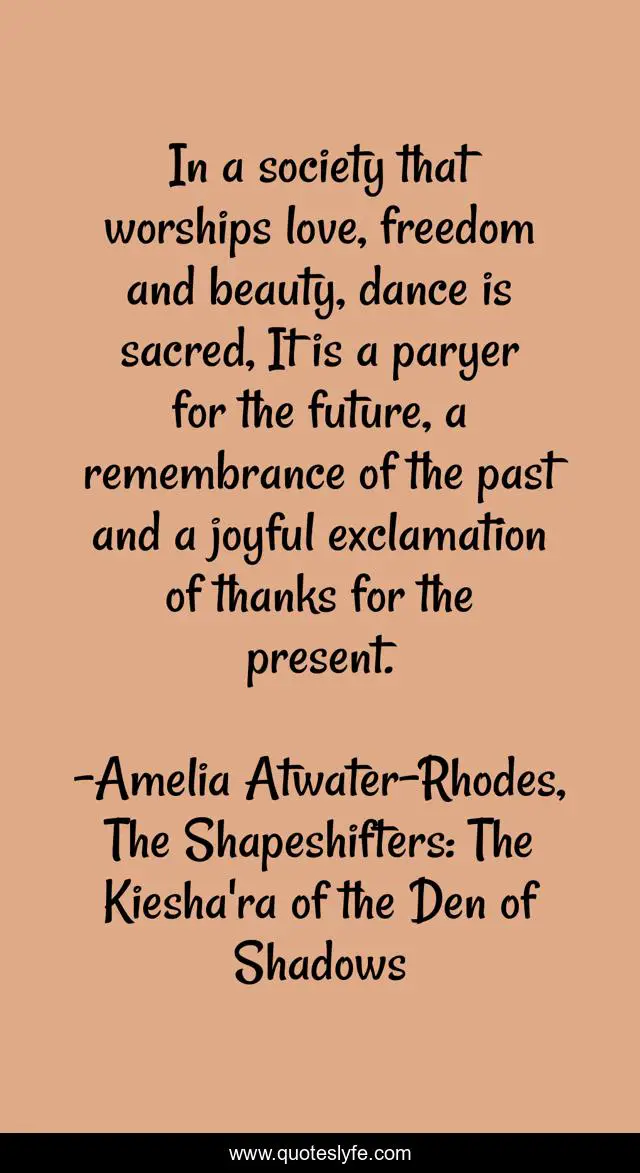 This page presents the quote "In a society that worships love, freedom and beauty, dance is sacred, It is a paryer for the future, a remembrance of the past and a joyful exclamation of thanks for the present.". Author of this quote is Amelia Atwater-Rhodes, The Shapeshifters: The Kiesha'ra of the Den of Shadows. This quote is about dance, freedom, sacred-p-220,.