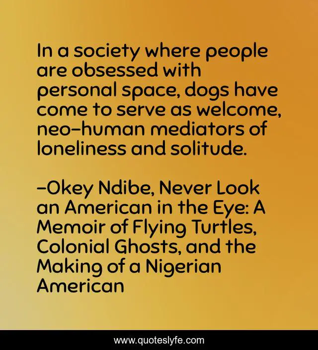 This page presents the quote "In a society where people are obsessed with personal space, dogs have come to serve as welcome, neo-human mediators of loneliness and solitude.". Author of this quote is Okey Ndibe, Never Look an American in the Eye: A Memoir of Flying Turtles, Colonial Ghosts, and the Making of a Nigerian American. This quote is about dogs-and-humans, dogs, personal-space,.