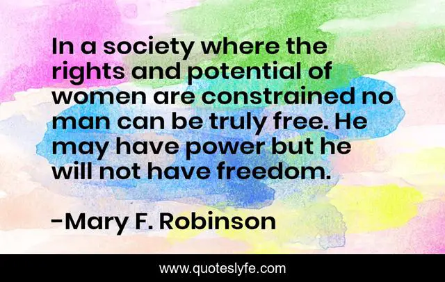 This page presents the quote "In a society where the rights and potential of women are constrained no man can be truly free. He may have power but he will not have freedom.". Author of this quote is Mary F. Robinson. This quote is about control, self,.