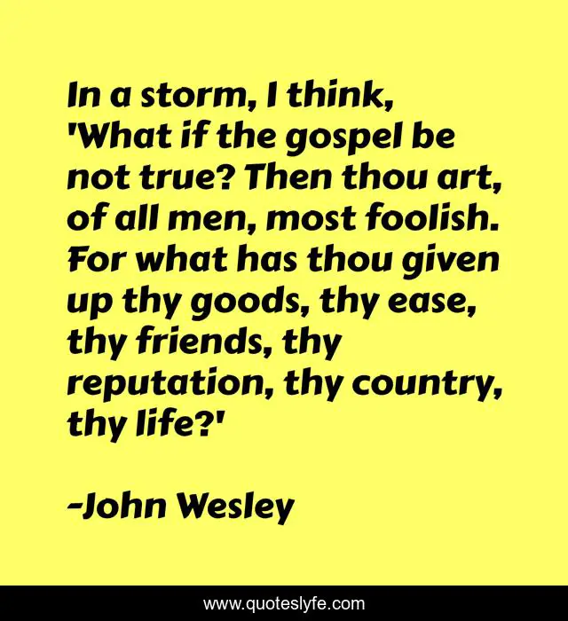 This page presents the quote "In a storm, I think, 'What if the gospel be not true? Then thou art, of all men, most foolish. For what has thou given up thy goods, thy ease, thy friends, thy reputation, thy country, thy life?'". Author of this quote is John Wesley. This quote is about life, friends, storm,.