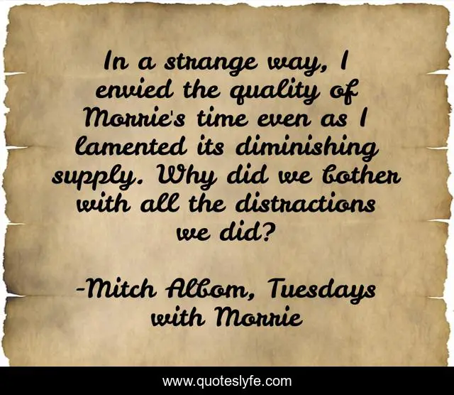 This page presents the quote "In a strange way, I envied the quality of Morrie's time even as I lamented its diminishing supply. Why did we bother with all the distractions we did?". Author of this quote is Mitch Albom, Tuesdays with Morrie. This quote is about life, death-and-dying, wasted-time,.